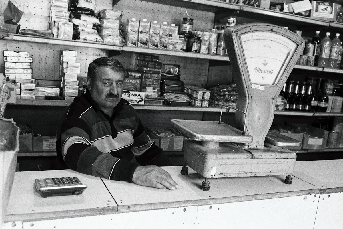 A vendor proudly displays his collection of furs and karakul pelts, a key ingredient in traditional men's hats.
