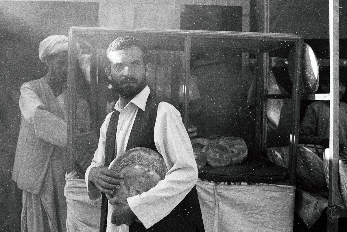Waiter serves up a hot cup of chai in an Afghan roadside cafe, where a SpongeBob SquarePants curtain adds a whimsical touch to the rustic surroundings.
