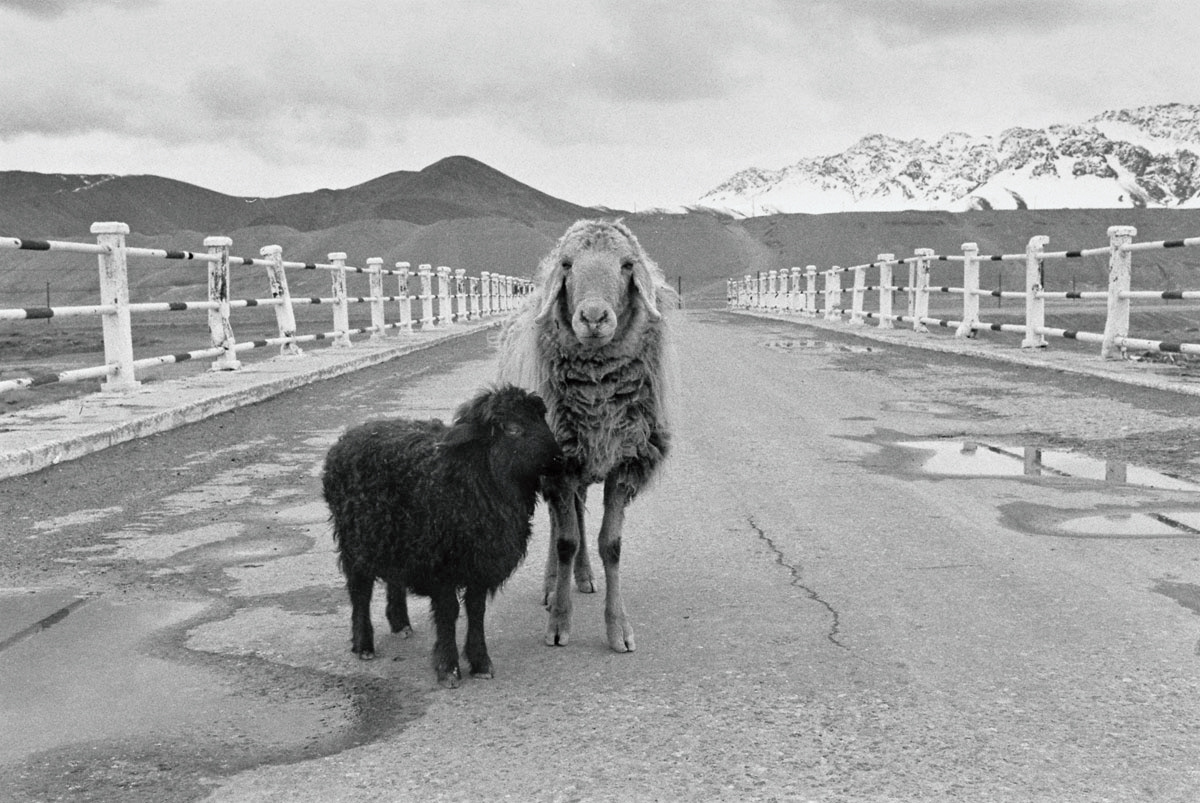 Three bovine passengers take in the breathtaking scenery of the Pamir mountains as they travel in the back of a cargo truck, a common mode of transportation for both people and livestock in this remote region.
