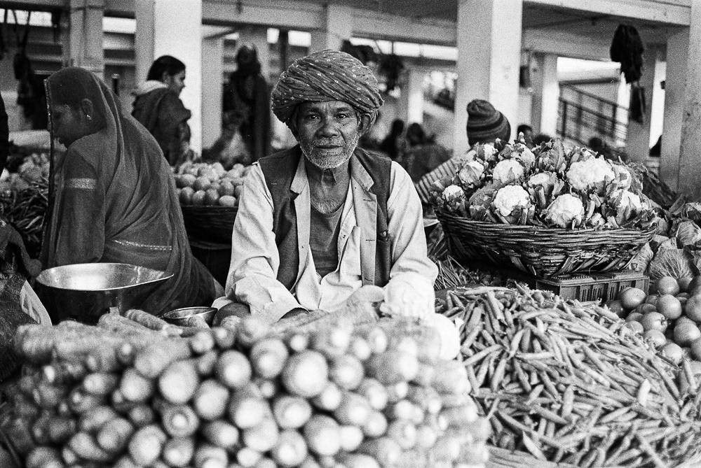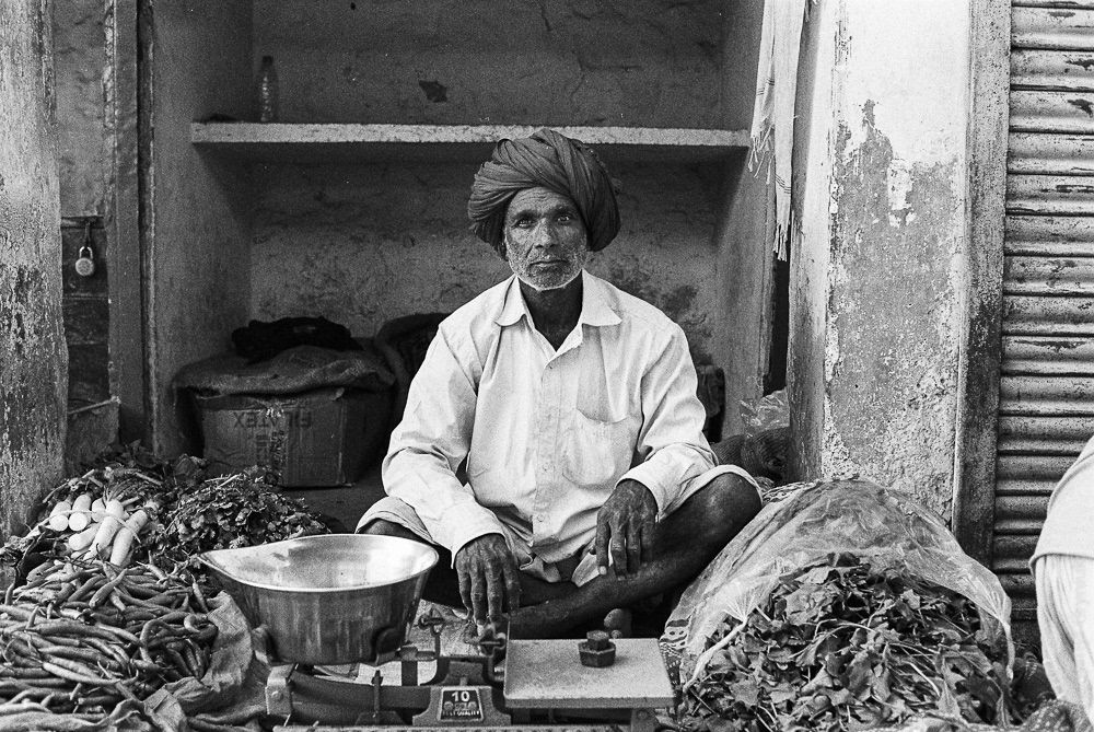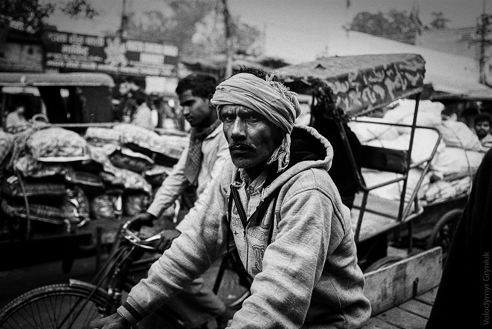 A porter sits on his cart, awaiting customers who require assistance with transporting goods around Delhi Spice Market.